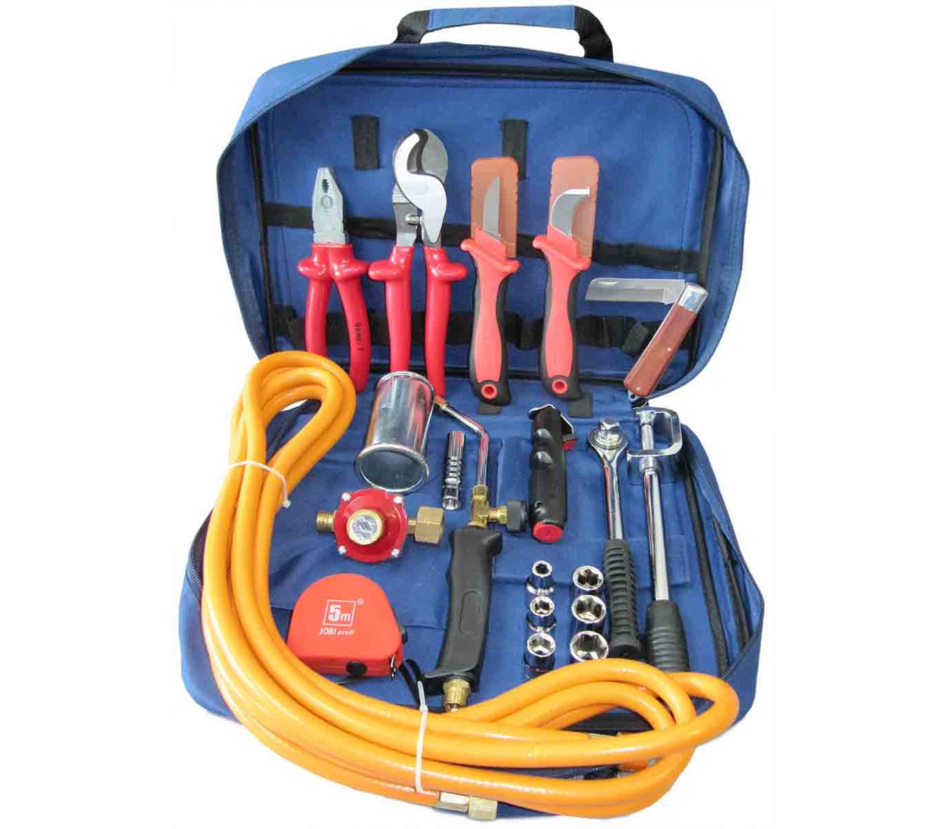 Набор включает в себя 12 предметов и состоит из изолированных плоскогубцев, кусачек и длинногубцев, отверток, пресс-клещей, кабельных ножей, ножовки по металлу, рожковых ключей, торцевых головок, газовой горелки и рукава высокого давления.
