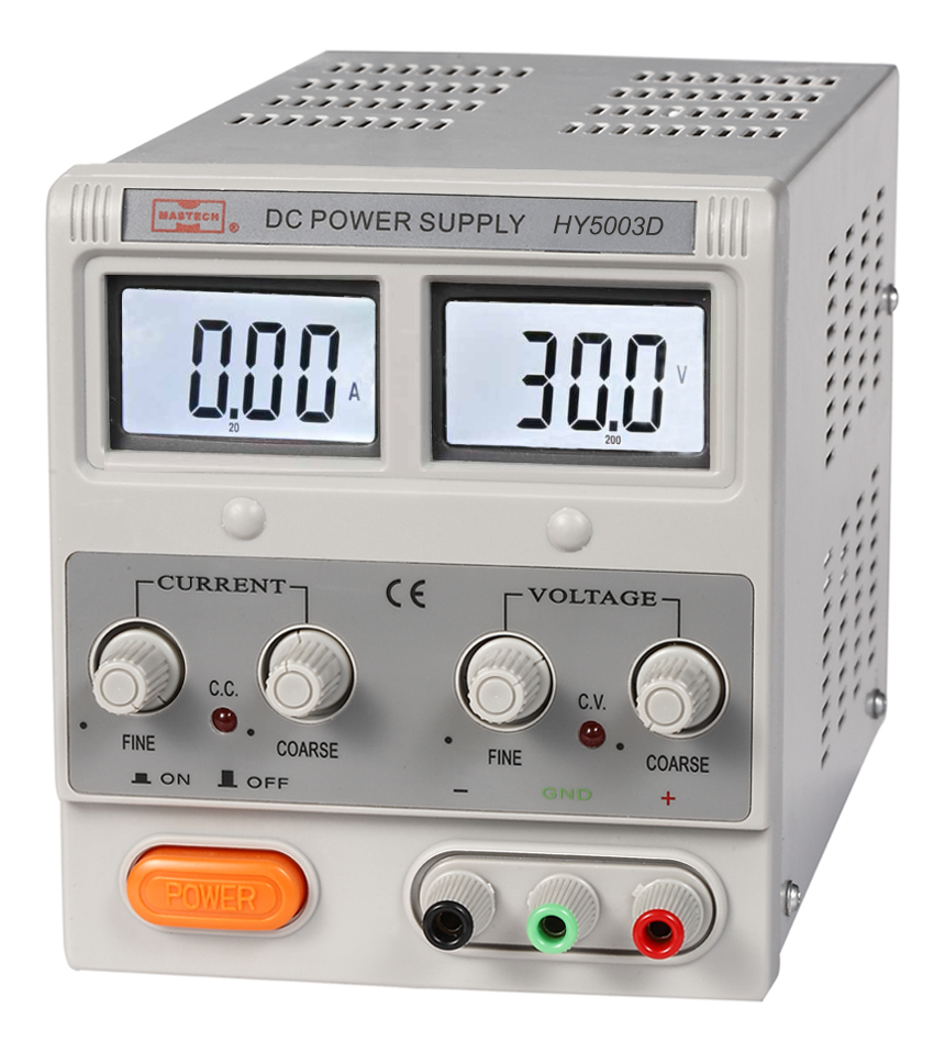 Mastech HY5003D – источник питания, позволяющий получать регулируемое, точное и стабильное постоянное напряжение или постоянный ток. Две пары регуляторов грубой и точной настройки облегчают установку напряжения и тока, а цифровые индикаторы тока и напряжения упрощают считывание параметров выхода.