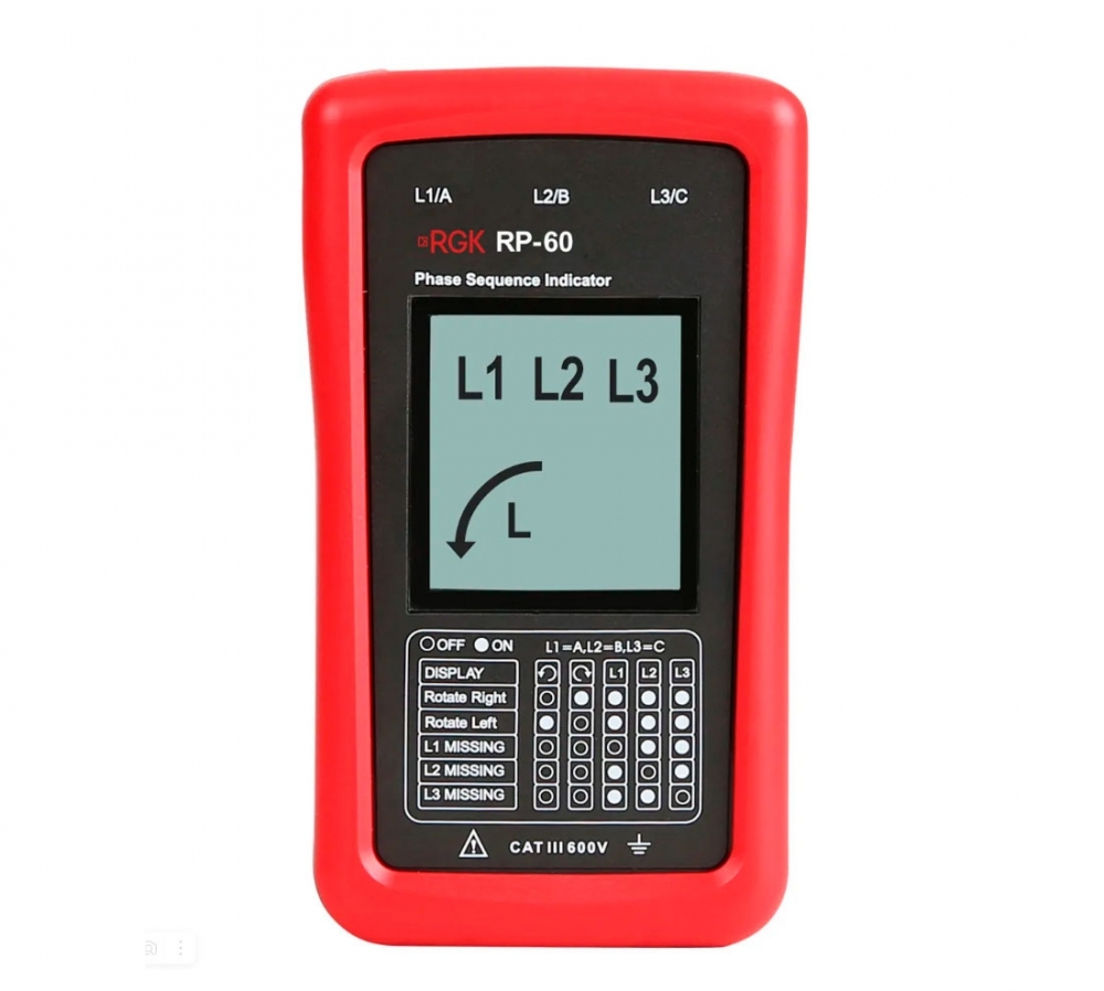 Индикатор чередования фаз RGK RP-60 автоматически включается при подключении к трехфазной сети. На большом дисплее наглядно отображаются индикаторы последовательности и наличия фаз. Более того, под экраном расположена памятка, благодаря которой интерпретировать показания прибора безошибочно сможет даже человек без специальных знаний. Пользователь может с первого взгляда заметить проблему - отсутствие одного из трех индикаторов говорит о том, что на фазе нет напряжения из-за повреждения или неисправности проводника.